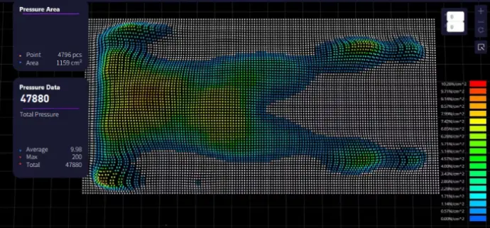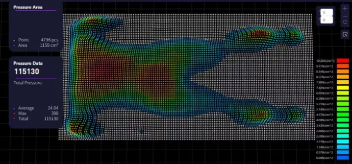 El sistema de mapeo de presión proporciona conocimiento acerca de la presión de la interfaz entre una persona y la superficie en la que se encuentra, utilizando una hoja de medición compuesta de puntos de medición individuales.